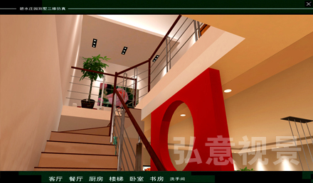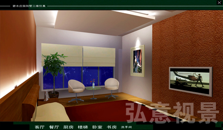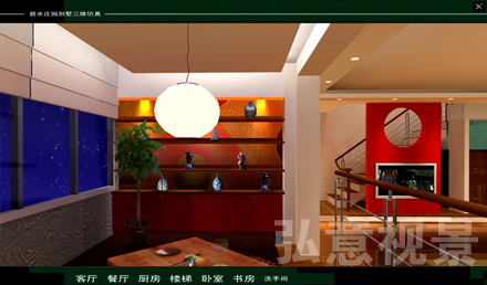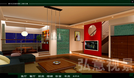 弘意制作人員在模型上使用單片建模方式,模型用的是簡模,由于空間小,裝飾品多,而且要突出表現(xiàn)材質(zhì)與燈光效果,所以在模 型制作方法、色彩把握、燈光表現(xiàn)上要比室外難得多。只有把技術(shù)和感覺容在一起才能做出上層的作品。同時這個作品還加入了打開 電視機、開關(guān)水龍頭、打開煤氣等虛擬現(xiàn)實交互功能。